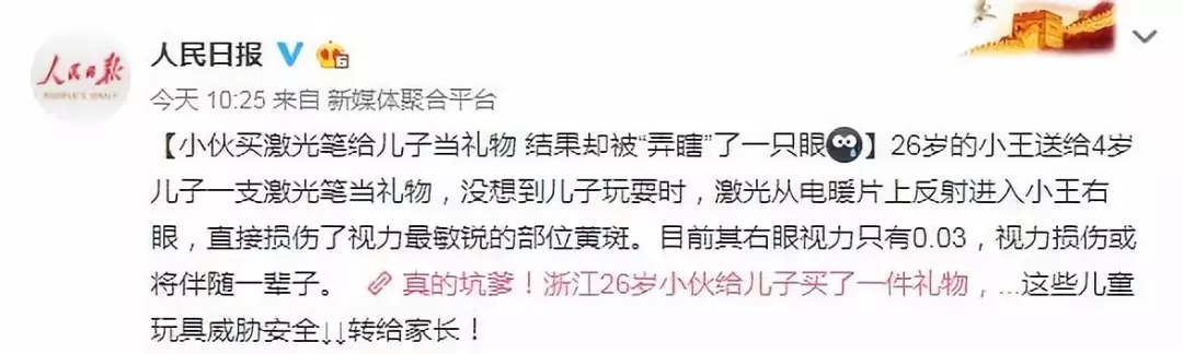 這可不是危言聳聽,我們稍微搜索一下“激光筆”就能發(fā)現(xiàn),因激光眼灼燒眼睛而導(dǎo)致視力嚴(yán)重受損的新聞數(shù)不勝數(shù),比如“父親買激光筆給孩子當(dāng)禮物,孩子卻被光束灼傷眼部,視力僅剩0.03”,“某小伙培訓(xùn)時(shí)被導(dǎo)師用激光筆照到了眼睛,檢查后發(fā)現(xiàn)視力降到0.4”等等,看完這些令人瑟瑟發(fā)抖的新聞,你還敢小看激光筆嗎?
