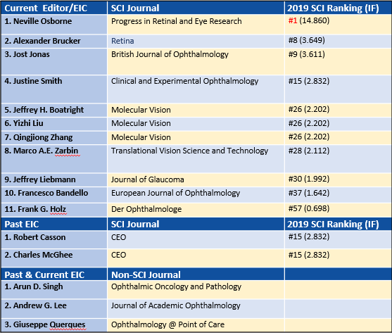 林順潮教授(亞太眼科學(xué)會前任會長、亞太眼科科學(xué)院秘書長)是APJO的創(chuàng)刊及現(xiàn)任總編輯。 而Jost Jonas教授 (德國科學(xué)院院士、英國眼科雜志主編)于2019年成為第二總編輯。