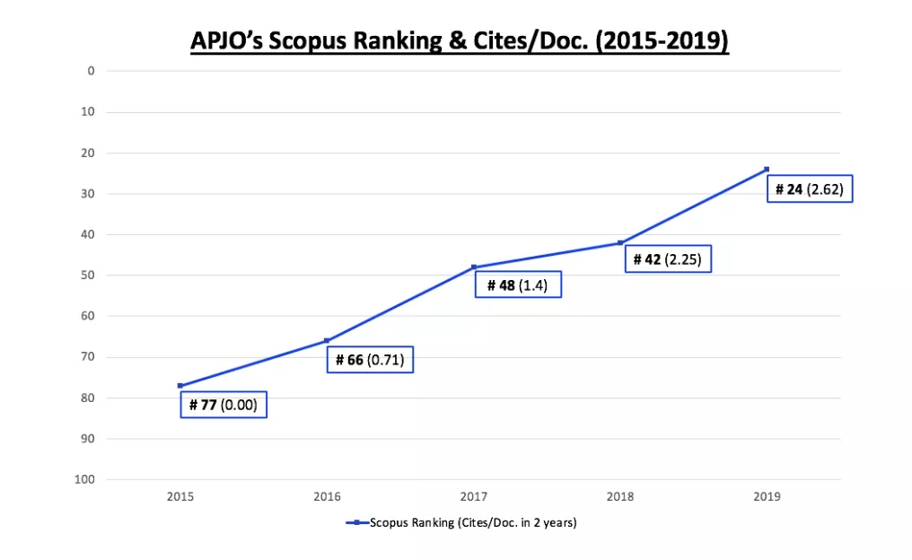 APJO在2019年Scopus眼科期刊的排名是第24位,并呈持續(xù)上升的趨勢 (見下圖)。估計在2020年全球SCI眼科期刊排行榜中,APJO可能位列第21-25位之間(SCI約有60本的眼科醫(yī)學(xué)雜志,而2020年的SCI排名將于2021年6月宣布)。
