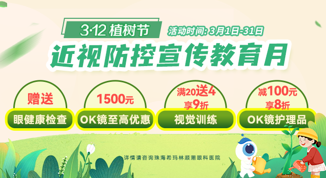 活動(dòng)時(shí)間:3月1日—3月31日活動(dòng)內(nèi)容:青少年到院0元享近視防控基礎(chǔ)檢查及專家定制近視防控方案;同時(shí)配鏡還能優(yōu)惠哦:OK鏡至高優(yōu)惠1500元,近視防控型眼鏡至高優(yōu)惠1000元,普通框架眼鏡9折優(yōu)惠;雙眼視功能異常訓(xùn)練滿20次送4次,計(jì)算機(jī)訓(xùn)練9折優(yōu)惠;OK鏡護(hù)理品買滿600元減100元,滿1000元8折優(yōu)惠....