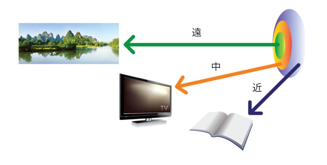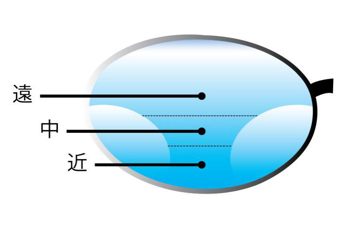 漸進(jìn)式隱型眼鏡是為老花而設(shè)計(jì)的隱形眼鏡,有多種不同的設(shè)計(jì),例如下圖便是其中一種。鏡片由中心環(huán)展至外圍,漸進(jìn)為三個(gè)部分調(diào)整視距,使雙眼能適應(yīng)不同的目標(biāo)距離,令遠(yuǎn)、中、近距離的視物都清晰可見(jiàn)。