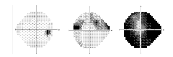 左:視力正常人士的視野;中:早期青光眼患者的視野;右:晚期青光眼患者的視野圖