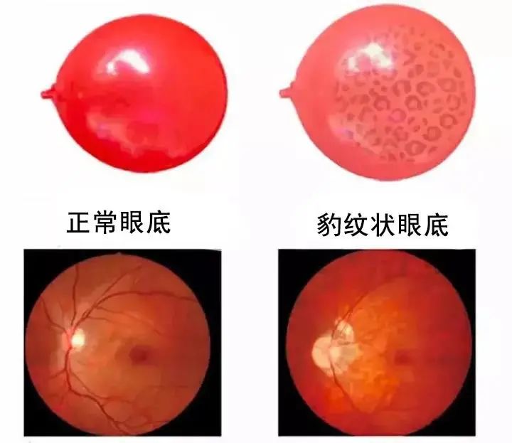 而且,明明的眼底照也已呈現(xiàn)出高度近視特有的豹紋狀特征,一般而言,眼軸每增長1個毫米,近視度數(shù)就增加250-300度,這樣可初步懷疑明明的近視度數(shù)已經(jīng)超過了600度。