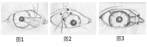 在切除胬肉病變后(圖1),在附近健康的角鞏緣處取自身結膜作為植片(圖2、3),覆蓋在已切除病變區(qū)域的鞏膜上,這種手術方式可以幫助減低復發(fā)率。