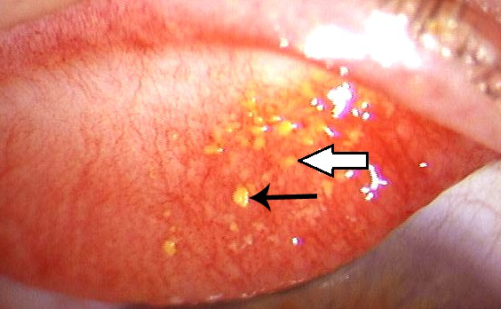 (未凸出結膜表面的結膜結石一般不引起癥狀 (白色箭嘴),多無需處理;但如果已經凸出表面(黑色箭嘴),則可能會對角膜產生摩擦,需要處理)